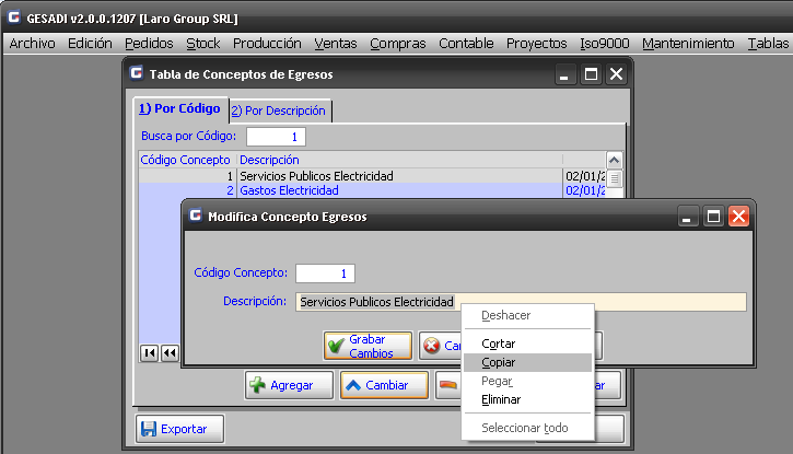 Para explicar en un mismo ejemplo las posibilidades de estas opciones, tomaremos de la Tabla de Conceptos de Egresos, el concepto creado, y la idea es generar un concepto, pero en Lugar de Servicio Públicos Electricidad, el nuevo concepto debe ser Servicios Públicos Agua.