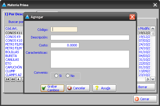 Cuenta con dos claves de búsqueda, y ordenamiento, por descripción y por Código de la Materia Prima. Al Agregar / Cambiar / Borrar / Consultar, se presenta la siguiente imagen: